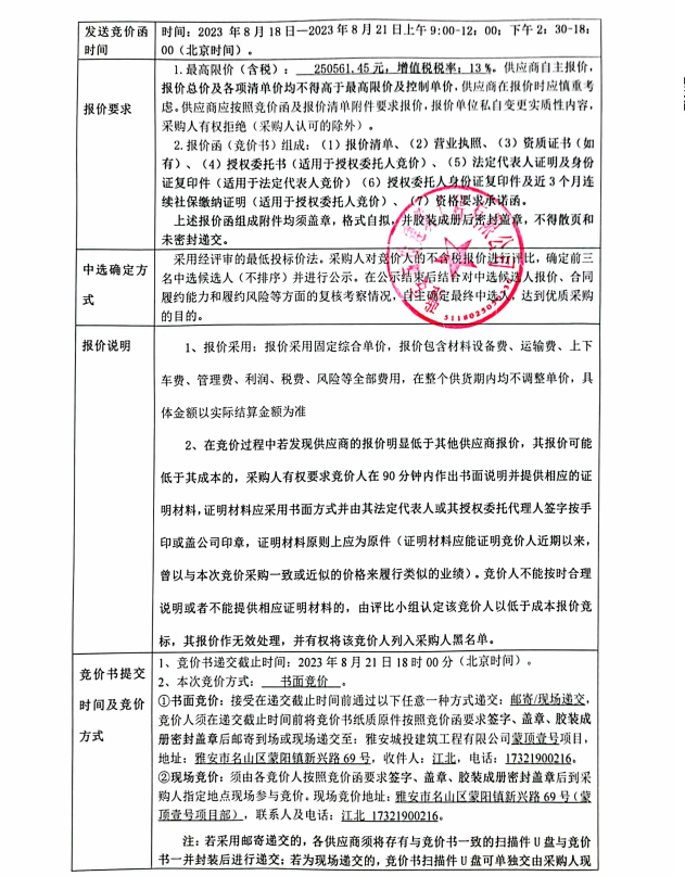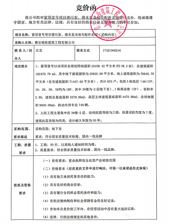蒙頂壹號項目潛污泵、潛水泵及相關(guān)配件采購競價公告