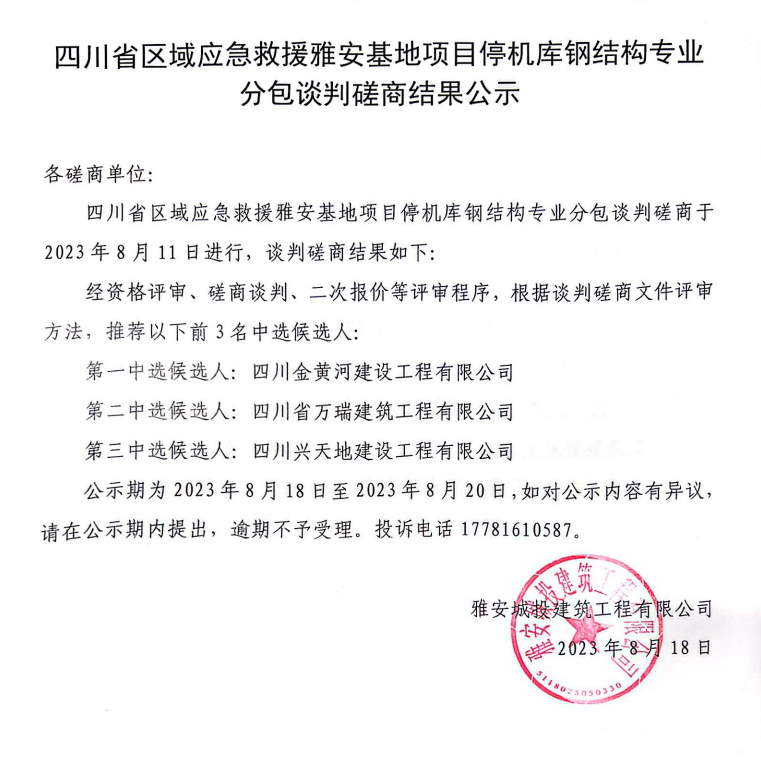 四川省區(qū)域應(yīng)急救援雅安基地項(xiàng)目停機(jī)庫(kù)鋼結(jié)構(gòu)專業(yè)分包談判磋商結(jié)果公示