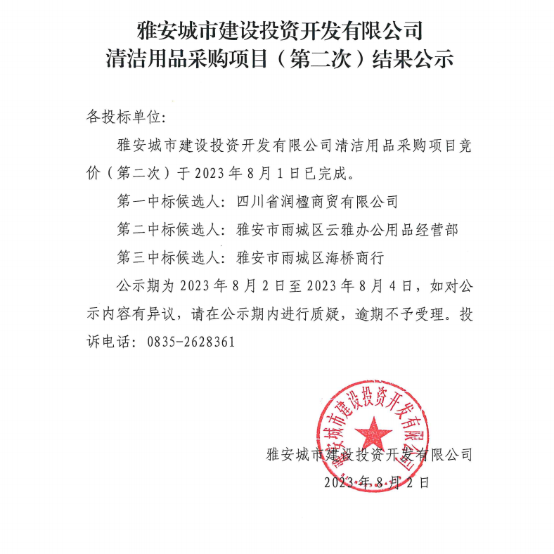 雅安城市建設(shè)投資開發(fā)有限公司清潔用品采購項目(第二次)結(jié)果公示