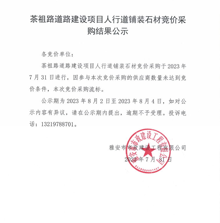 茶祖路道路建設(shè)項(xiàng)目人行道鋪裝石材競(jìng)價(jià)采購(gòu)結(jié)果公示