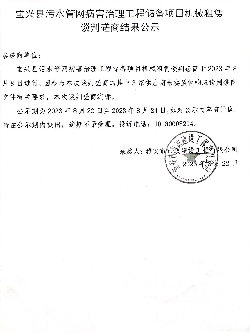 寶興縣污水管網(wǎng)病害治理工程儲(chǔ)備項(xiàng)目機(jī)械租賃談判磋商結(jié)果公示