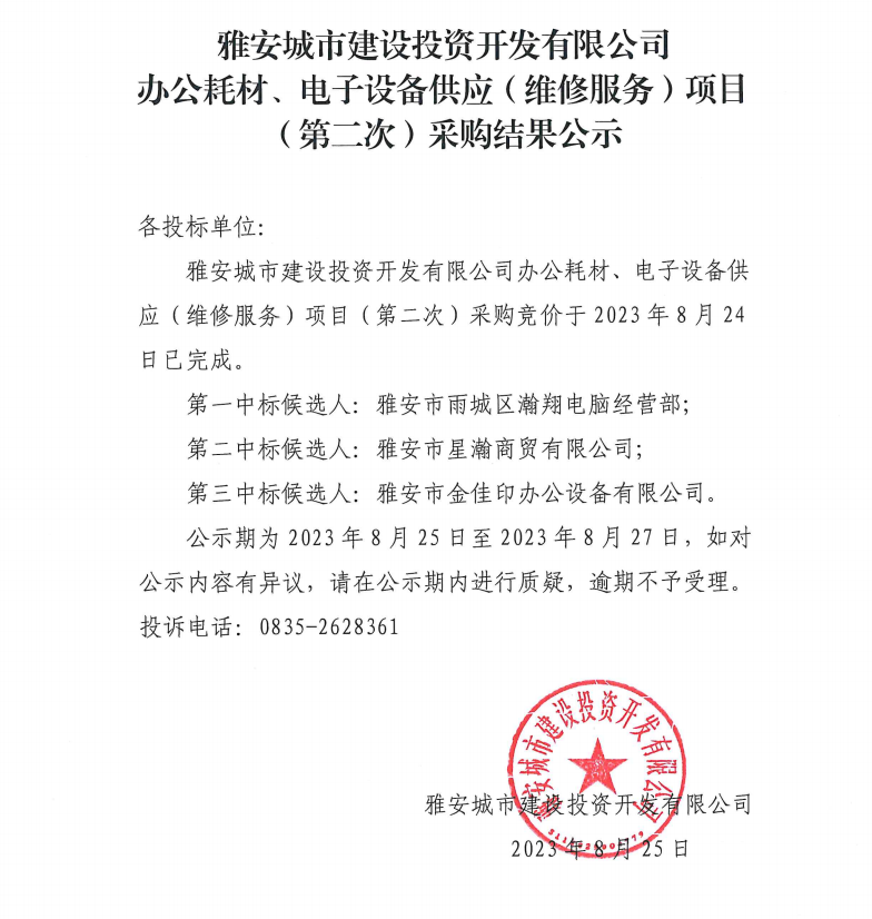 雅安城市建設投資開發(fā)有限公司辦公耗材、電子設備供應(維修服務)項目(第二次)采購結果公示