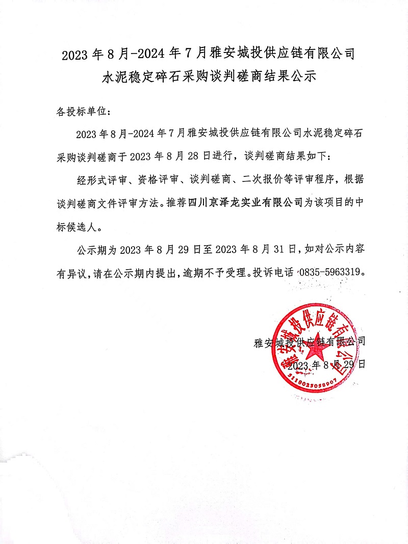 2023年8月-2024年7月雅安城投供應(yīng)鏈有限公司水泥穩(wěn)定碎石采購談判磋商結(jié)果公示