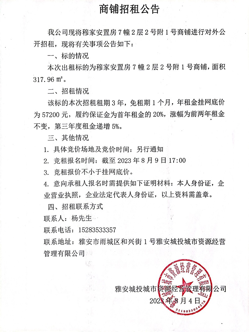 穆家安置房7幢2層附1號商鋪招租公告