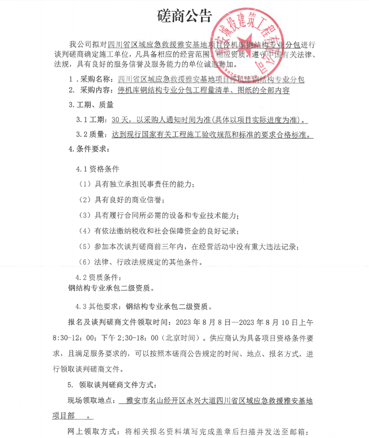 四川省區(qū)域應(yīng)急救援雅安基地項目停機(jī)庫鋼結(jié)構(gòu)專業(yè)分包談判磋商公告