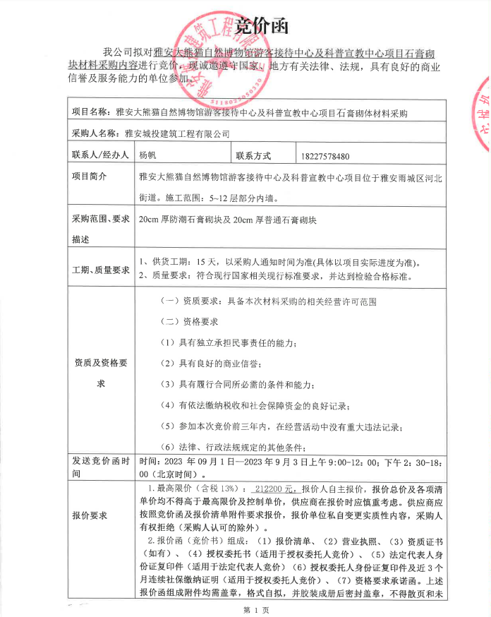雅安大熊貓自然博物館游客接待中心及科普宣教中心項(xiàng)目石膏砌塊材料采購內(nèi)容競價(jià)公告