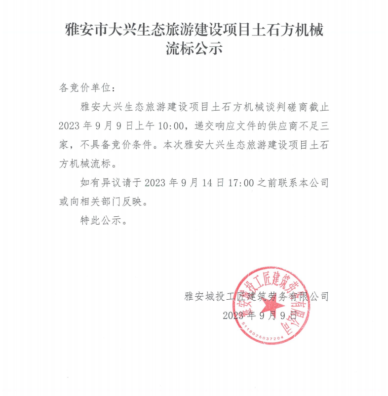 雅安市大興生態(tài)旅游建設(shè)項目土石方機(jī)械流標(biāo)公示