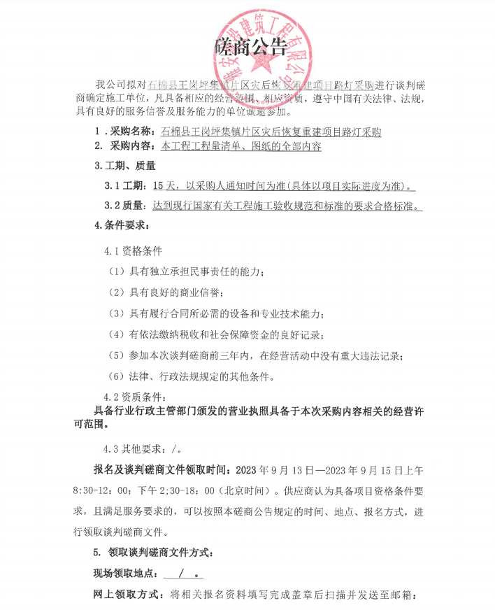 石棉縣王崗坪集鎮(zhèn)片區(qū)災(zāi)后恢復(fù)重建項(xiàng)目路燈采購(gòu)談判磋商公告