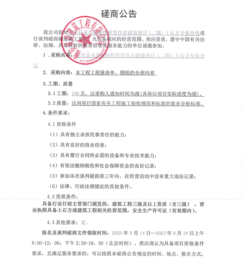 寶興縣靈關保障性租賃住房建設項目(二期)土石方專業(yè)分包談判磋商公告