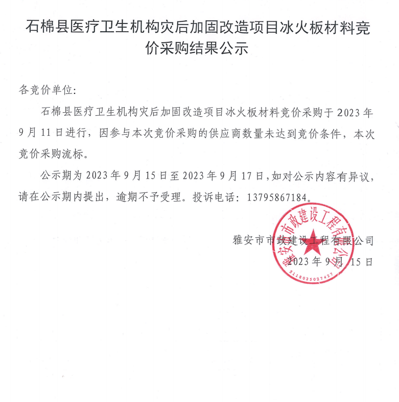 石棉縣醫(yī)療衛(wèi)生機(jī)構(gòu)災(zāi)后加固改造項目冰火板材料競價采購結(jié)果公示