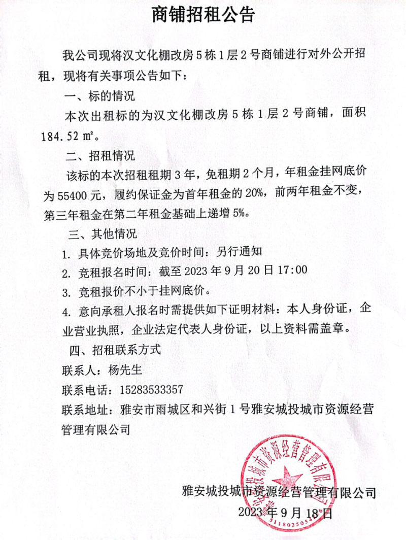 漢文化棚改房5棟1層2號(hào)商鋪招租公告
