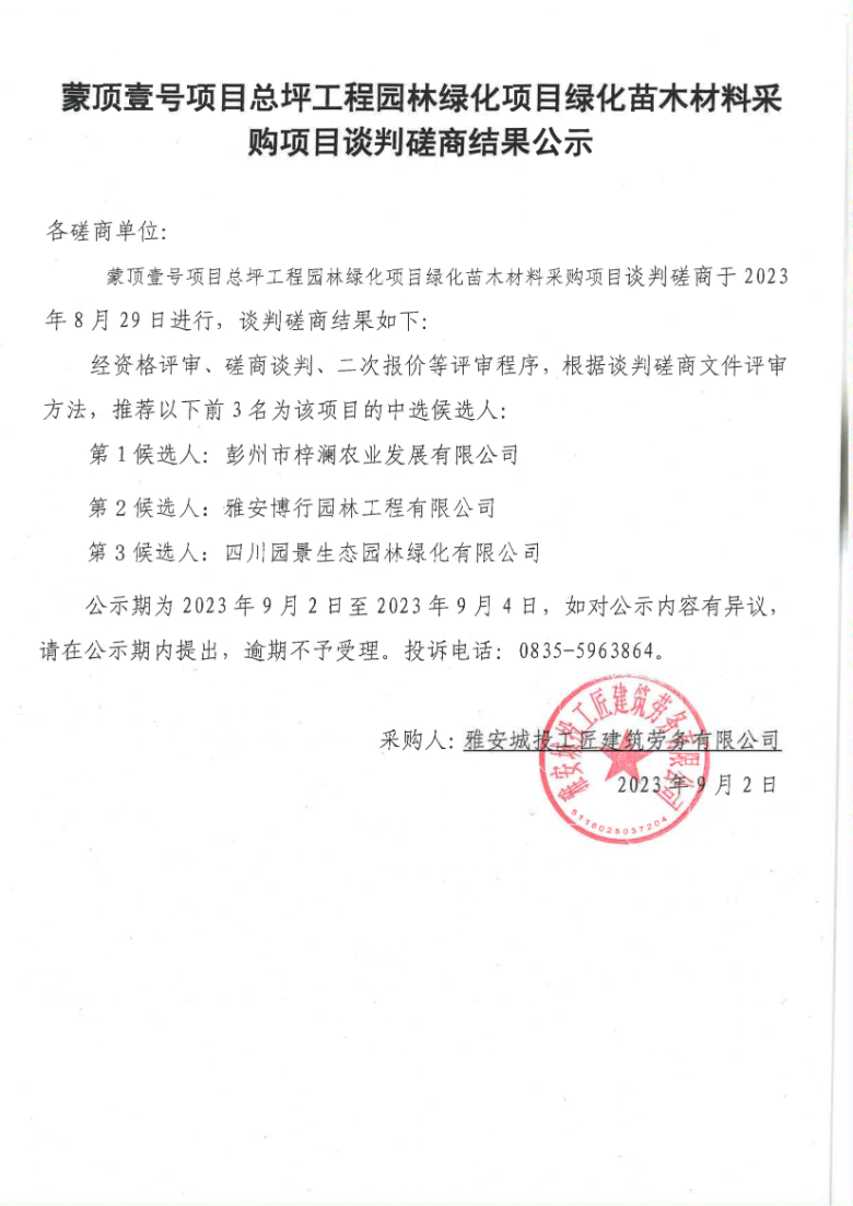 蒙頂壹號(hào)項(xiàng)目總坪工程園林綠化項(xiàng)目綠化苗木材料采購項(xiàng)目談判磋商結(jié)果公示