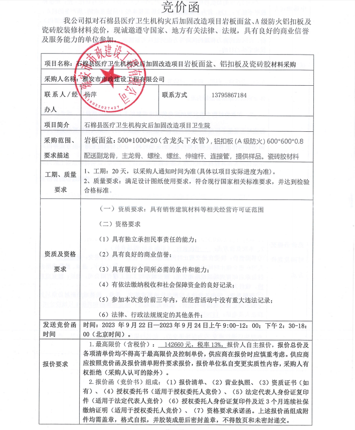 石棉縣醫(yī)療衛(wèi)生機構(gòu)災(zāi)后加固改造項目巖板面盆、A級防火鋁扣板及瓷磚膠材料采購競價公告