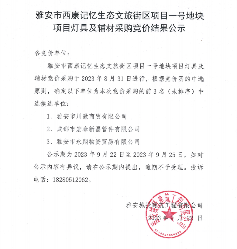 雅安市西康記憶生態(tài)文旅街區(qū)項(xiàng)目一號地塊項(xiàng)目燈具及輔材采購競價結(jié)果公示