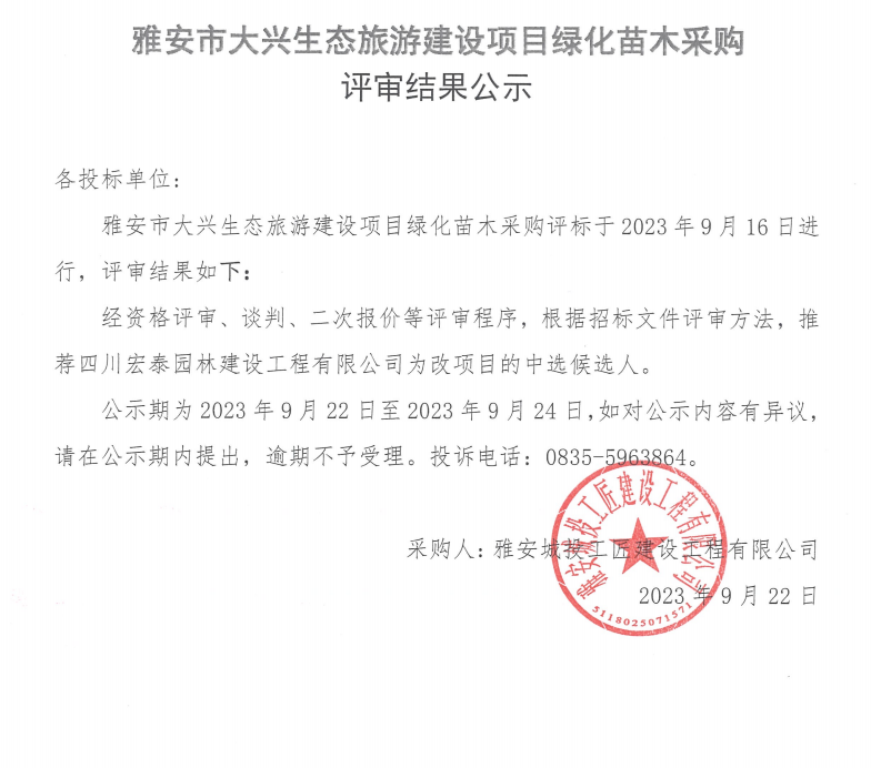 雅安市大興生態(tài)旅游建設(shè)項目綠化苗木采購評審結(jié)果公示