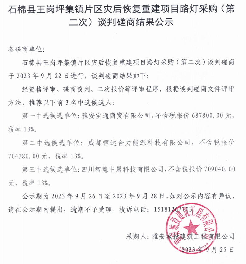 石棉縣王崗坪集鎮(zhèn)片區(qū)災(zāi)后恢復(fù)重建項(xiàng)目路燈采購(第二次)談判磋商結(jié)果公示