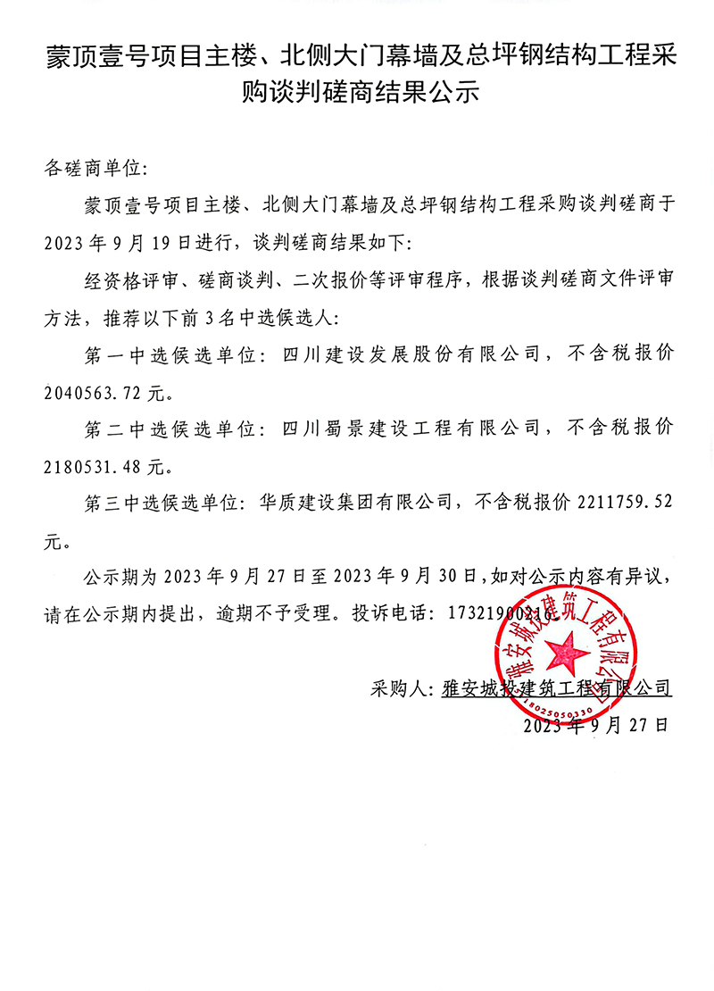 蒙頂壹號項目主樓、北側大門幕墻及總坪鋼結構工程采購談判磋商結果公示