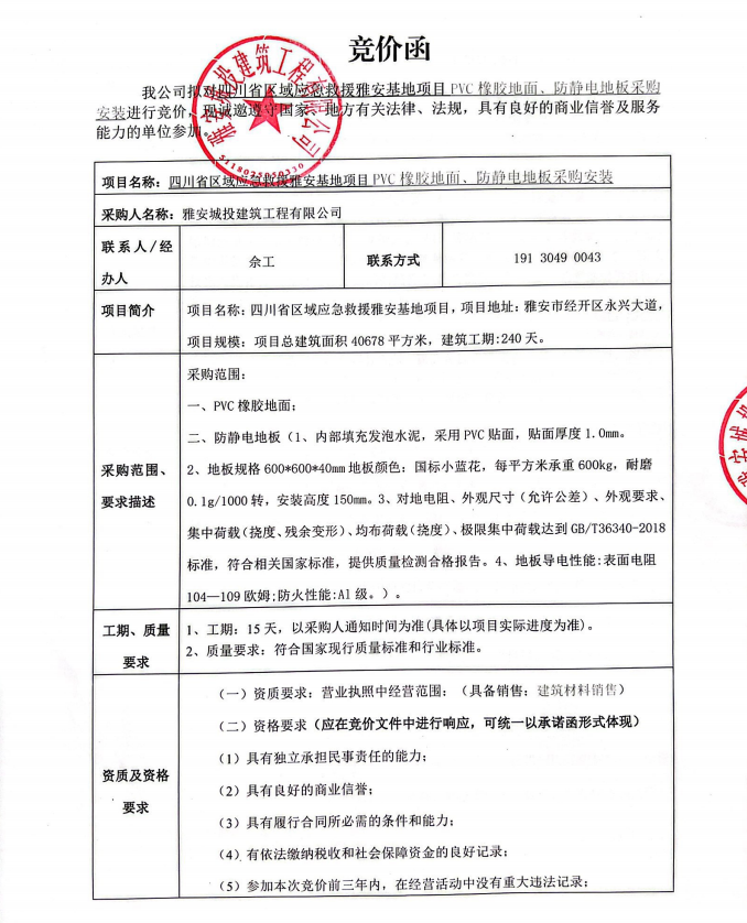 四川省區(qū)域應(yīng)急救援雅安基地項目PVC橡膠地面、防靜電地板采購安裝競價公告