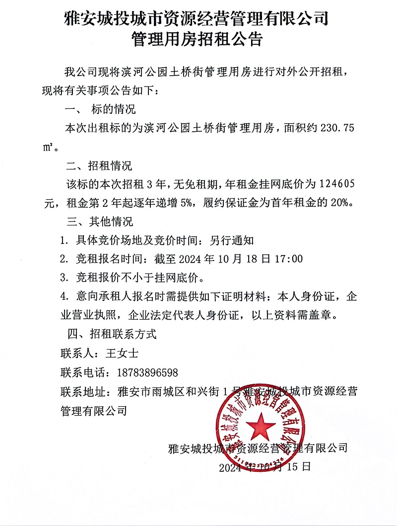 雅安城投城市資源經(jīng)營(yíng)管理有限公司關(guān)于濱江公園土橋街管理用房招租的公告