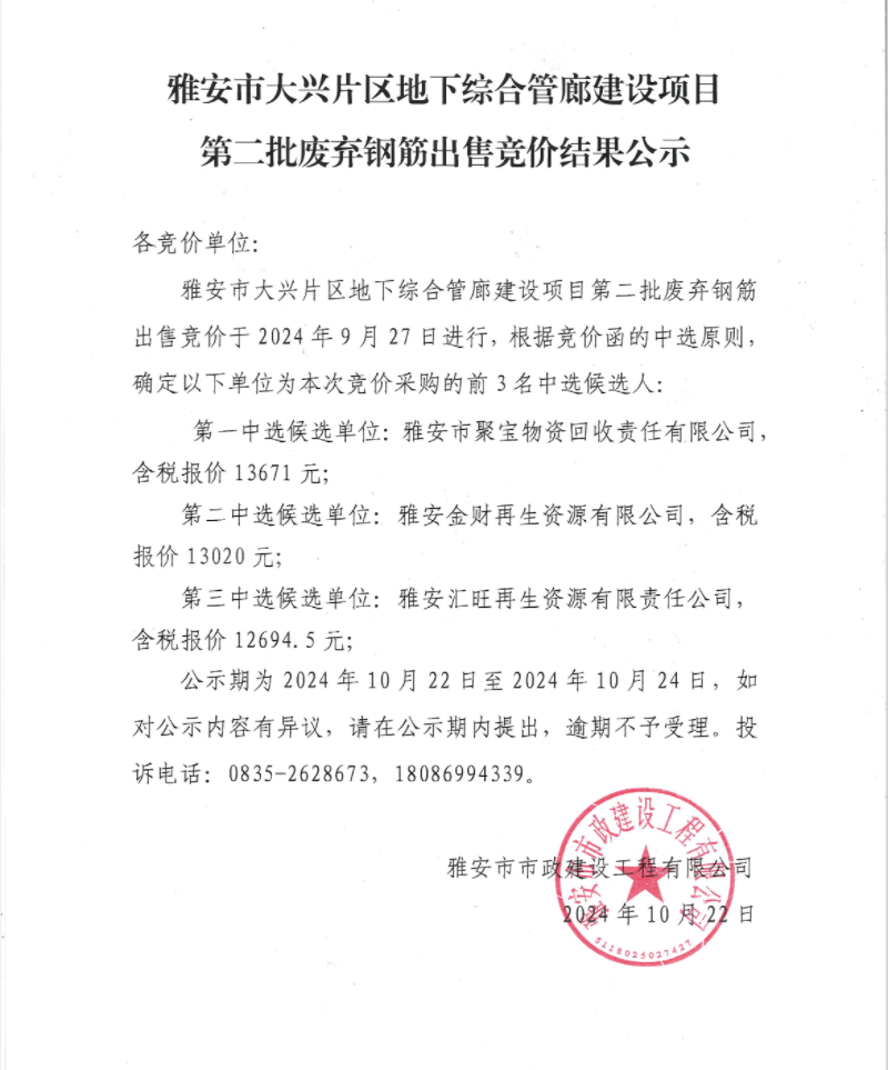 雅安市大興片區(qū)地下綜合管廊建設(shè)項目第二批廢棄鋼筋出售競價結(jié)果公示