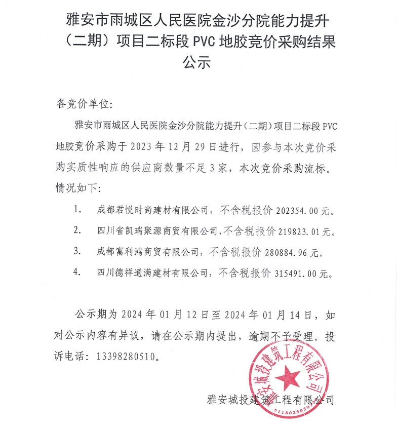 雅安市雨城區(qū)人民醫(yī)院金沙分院能力提升(二期)項目二標段PVC地膠競價采購結(jié)果公示