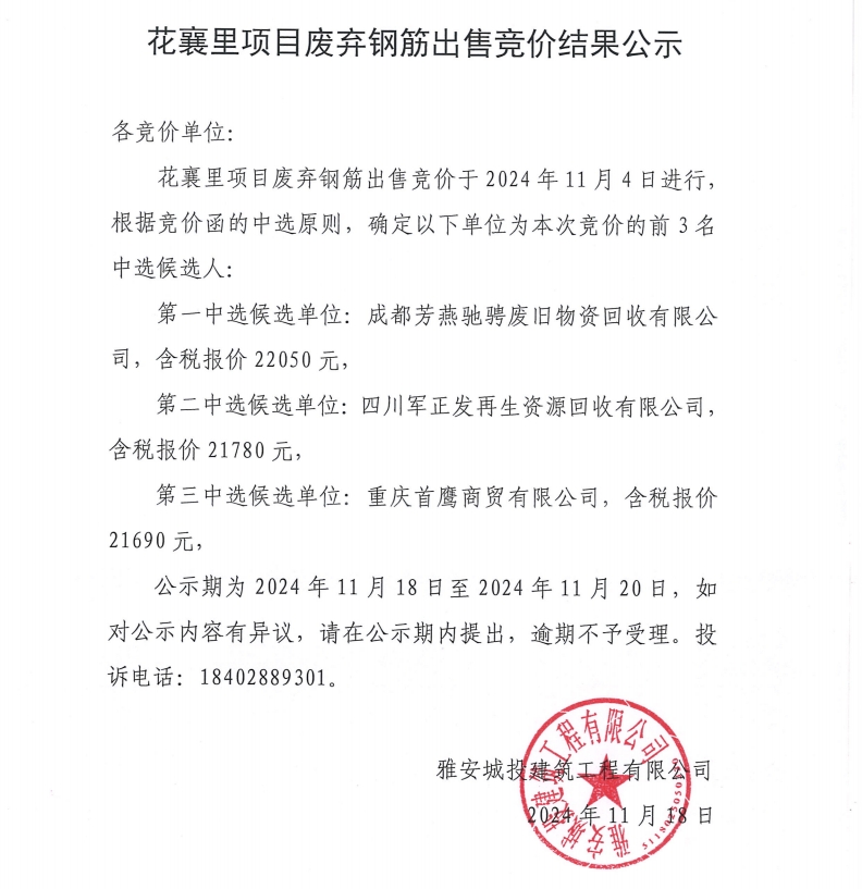 花襄·里項(xiàng)目廢棄鋼筋出售競(jìng)價(jià)結(jié)果公示