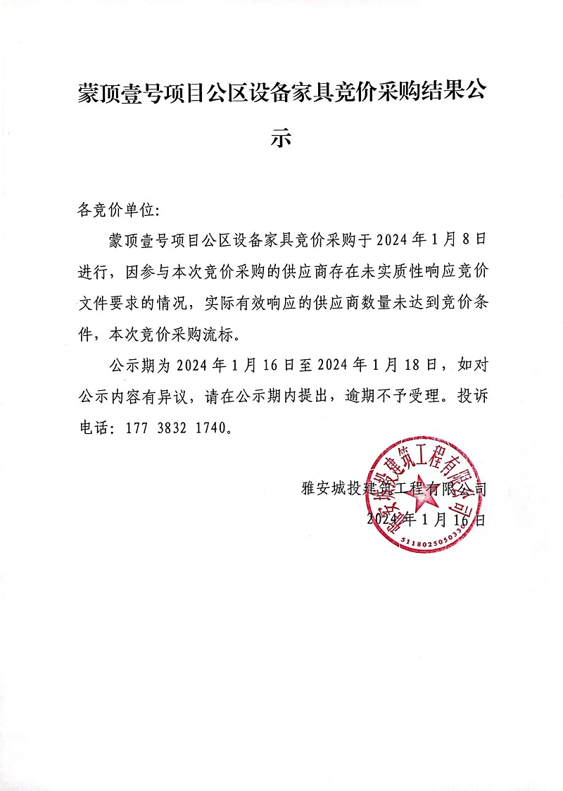 蒙頂壹號項目公區(qū)設(shè)備家具競價采購結(jié)果公示