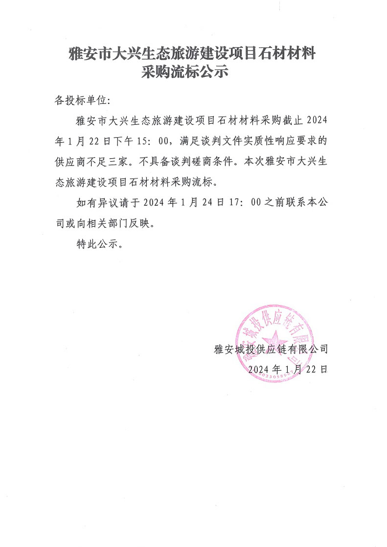 雅安市大興生態(tài)旅游建設(shè)項(xiàng)目石材材料采購(gòu)流標(biāo)公示