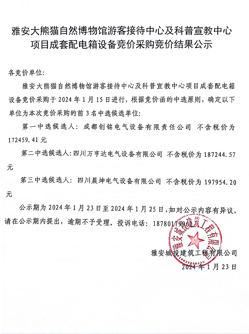 雅安大熊貓自然博物館游客接待中心及科普宣教中心項(xiàng)目成套配電箱設(shè)備競(jìng)價(jià)采購(gòu)競(jìng)價(jià)結(jié)果公示