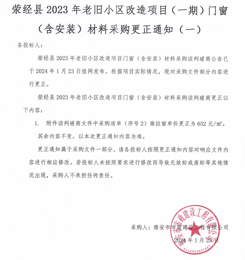 滎經(jīng)縣2023年老舊小區(qū)改造項(xiàng)目(一期)門窗(含安裝)材料采購更正通知(一)