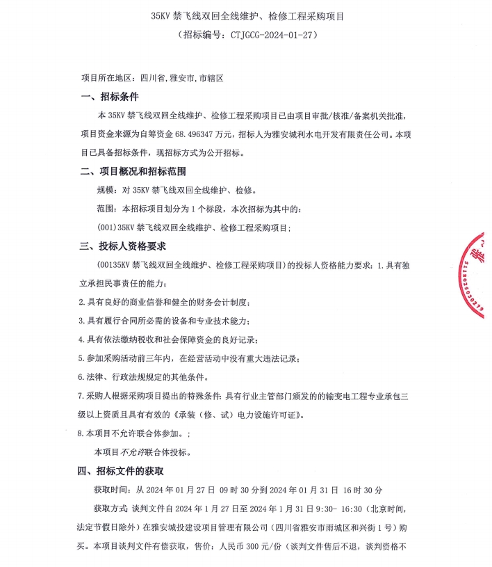 35KV禁飛線雙回全線維護(hù)、檢修工程采購(gòu)項(xiàng)目公告