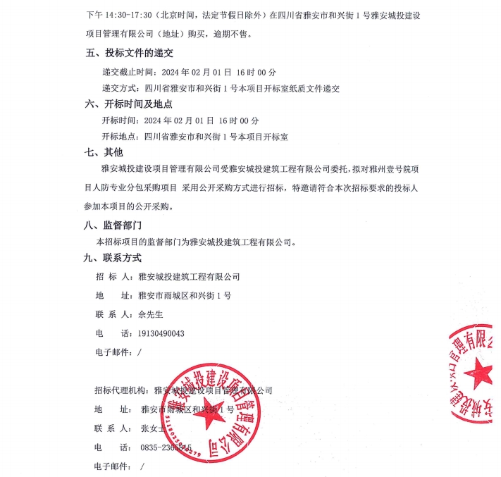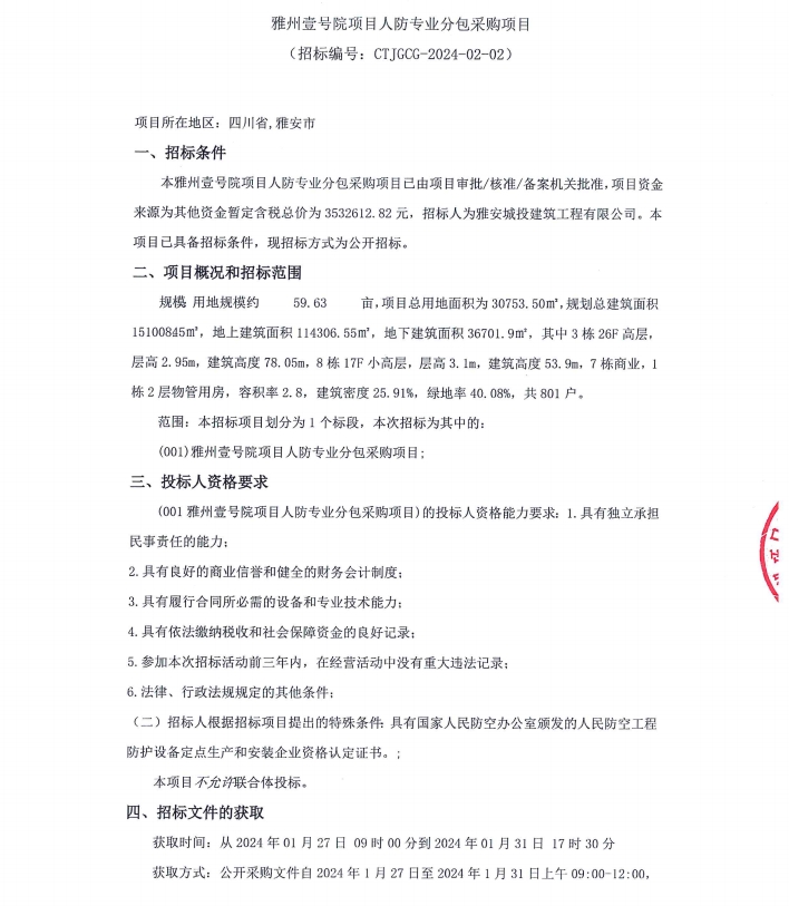 雅州壹號院項(xiàng)目人防專業(yè)分包采購項(xiàng)目公告