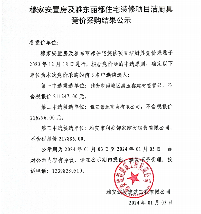 穆家安置房及雅東麗都住宅裝修項(xiàng)目潔廚具競(jìng)價(jià)采購(gòu)結(jié)果公示