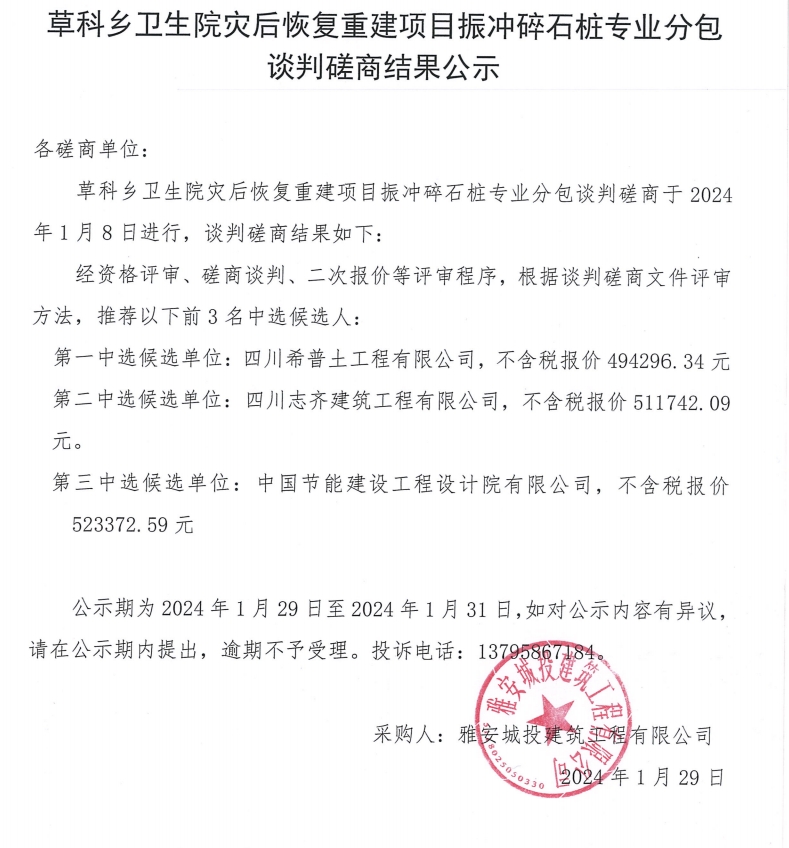 草科鄉(xiāng)衛(wèi)生院災后恢復重建項目振沖碎石樁專業(yè)分包談判磋商結果公示