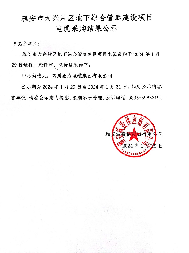 雅安市大興片區(qū)地下綜合管廊建設(shè)項(xiàng)目電纜采購結(jié)果公示