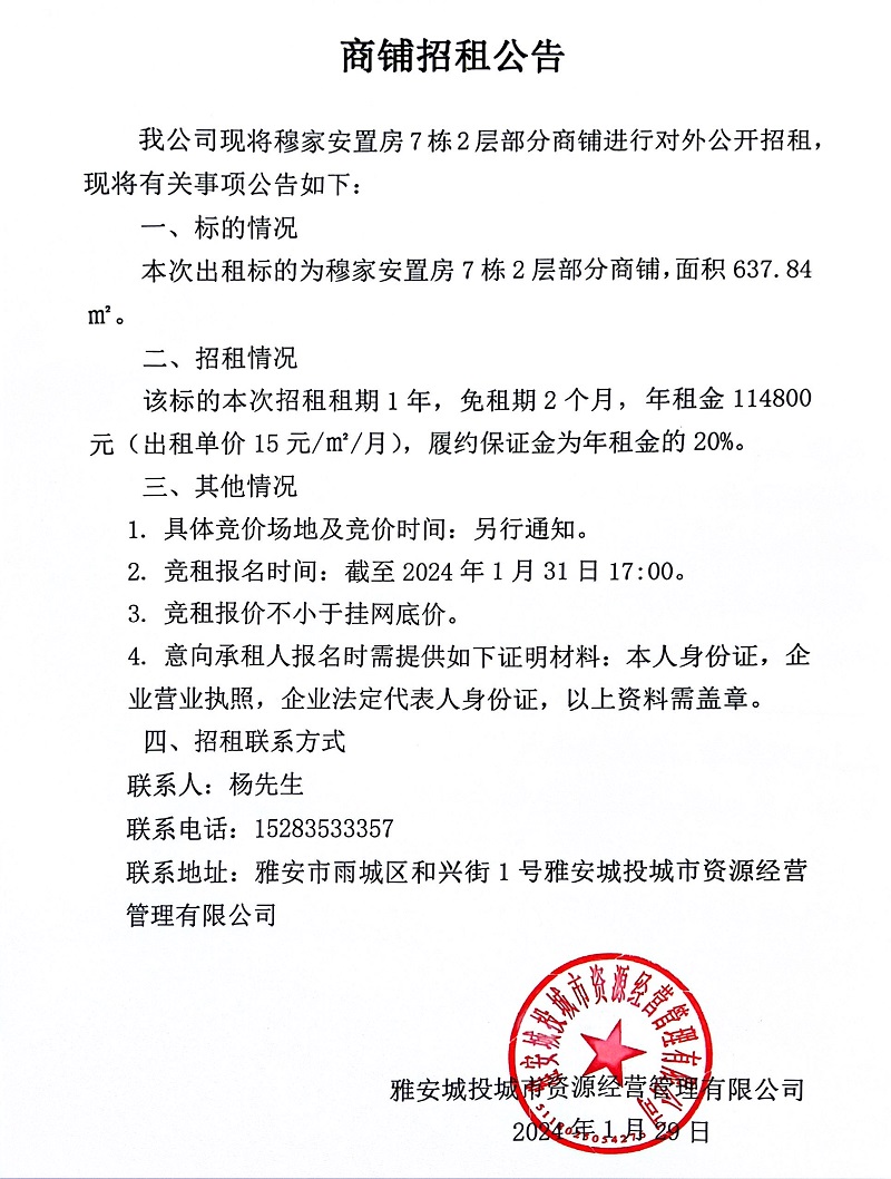 穆家安置房7棟2層部分商鋪招租公告