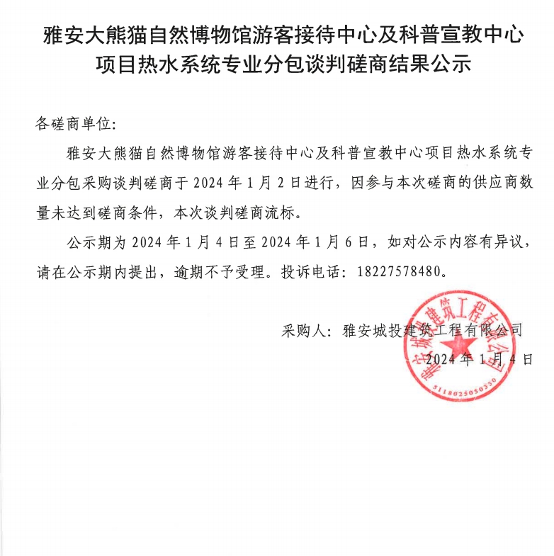 雅安大熊貓自然博物館游客接待中心及科普宣教中心項目熱水系統(tǒng)專業(yè)分包談判磋商結果公示
