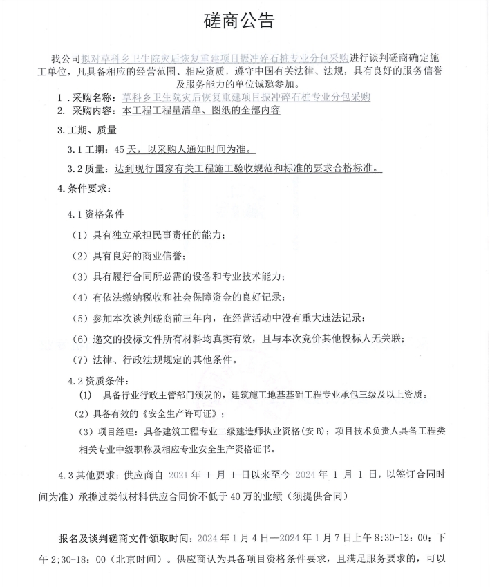 草科鄉(xiāng)衛(wèi)生院災(zāi)后恢復(fù)重建項目振沖碎石樁專業(yè)分包采購談判磋商公告