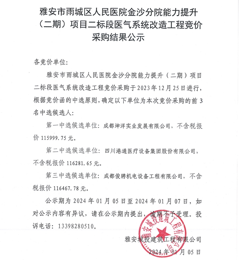 雅安市雨城區(qū)人民醫(yī)院金沙分院能力提升(二期)項目二標(biāo)段醫(yī)氣系統(tǒng)改造工程競價采購結(jié)果公示