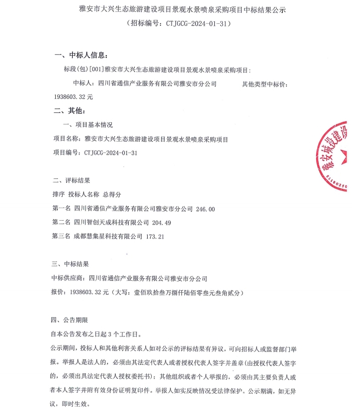 雅安市大興生態(tài)旅游建設(shè)項(xiàng)目景觀水景噴泉采購項(xiàng)目中標(biāo)結(jié)果公示