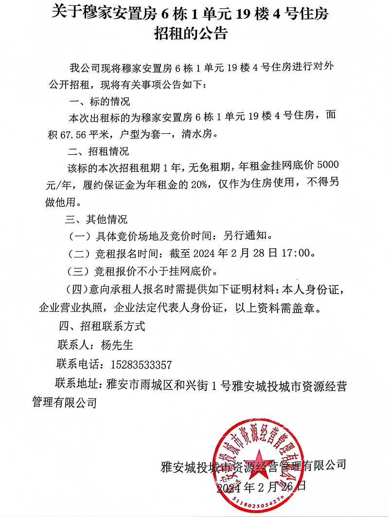 關(guān)于穆家安置房6棟1單元19樓4號住房招租的公告