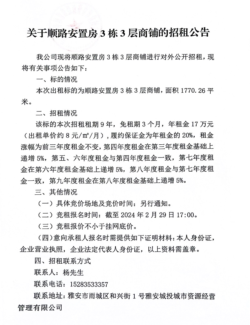 關于順路安置房3棟3層商鋪的招租公告