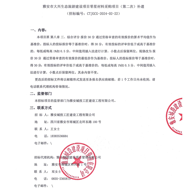 雅安市大興生態(tài)旅游建設(shè)項目零星材料采購項目(第二次)補(bǔ)遺公告