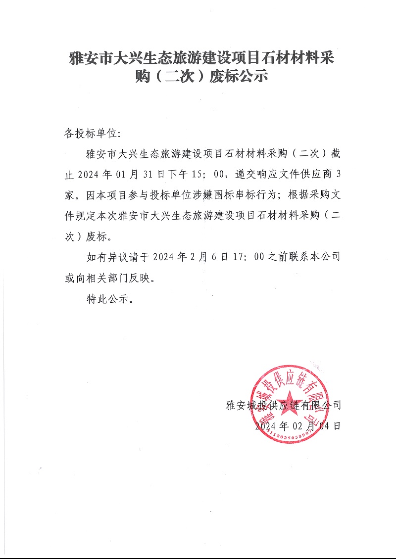 雅安市大興生態(tài)旅游建設(shè)項目石材材料采購(二次)廢標(biāo)公示