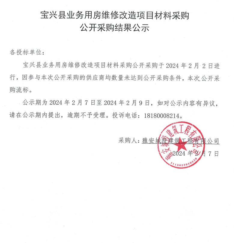 寶興縣業(yè)務(wù)用房維修改造項(xiàng)目材料采購(gòu)公開采購(gòu)結(jié)果公示