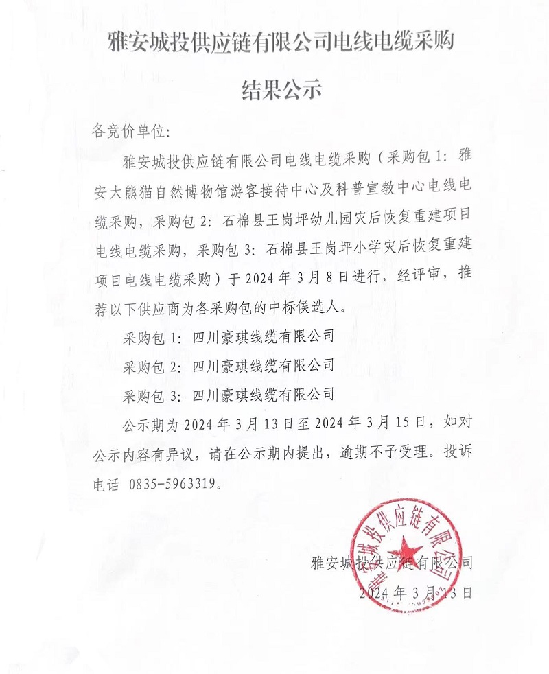 雅安城投供應(yīng)鏈有限公司電線電纜采購結(jié)果公示