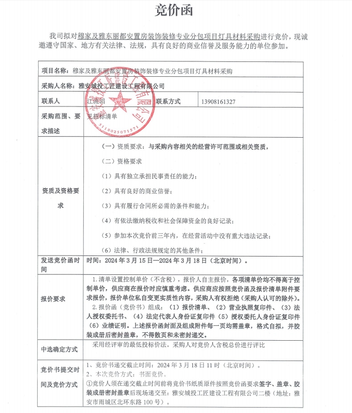 穆家及雅東麗都安置房裝飾裝修專業(yè)分包項(xiàng)目燈具材料采購競(jìng)價(jià)公告
