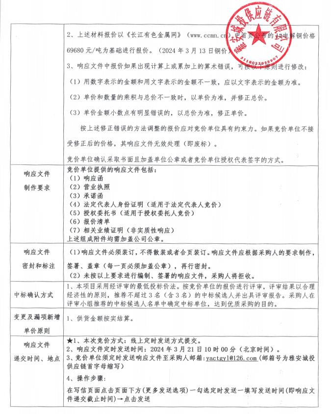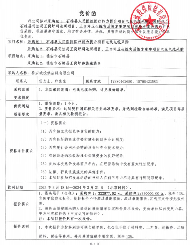 雅安城投供應(yīng)鏈有限公司電線電纜采購(gòu)競(jìng)價(jià)公告