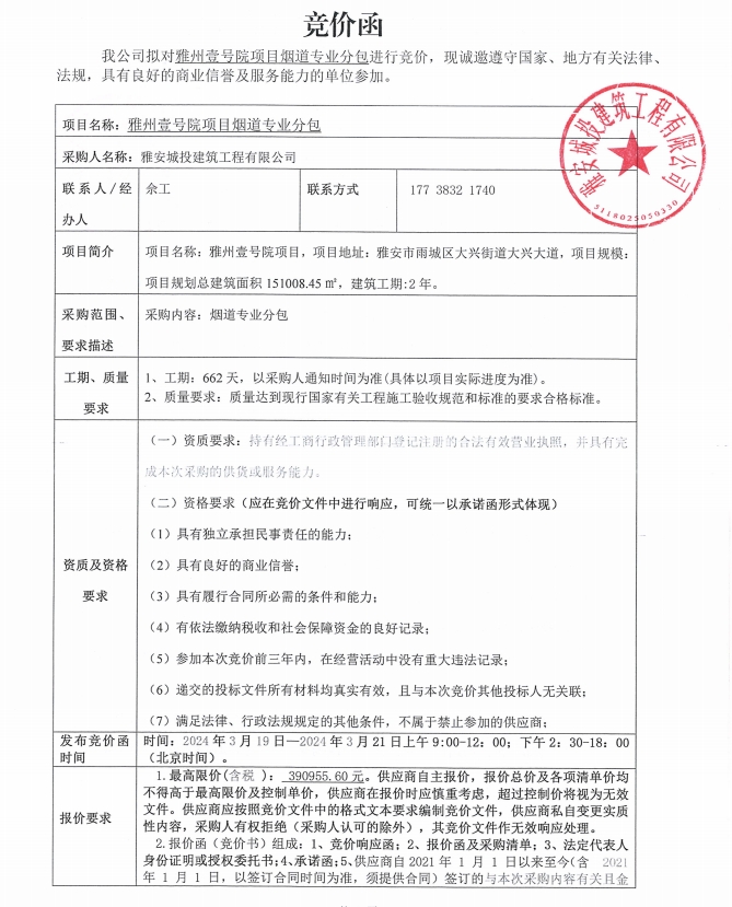 雅州壹號(hào)院項(xiàng)目煙道專業(yè)分包競價(jià)公告