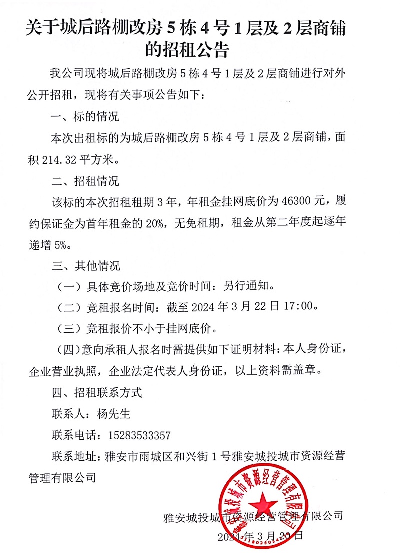 關于城后路棚改房5棟4號1層及2層商鋪的招租公告